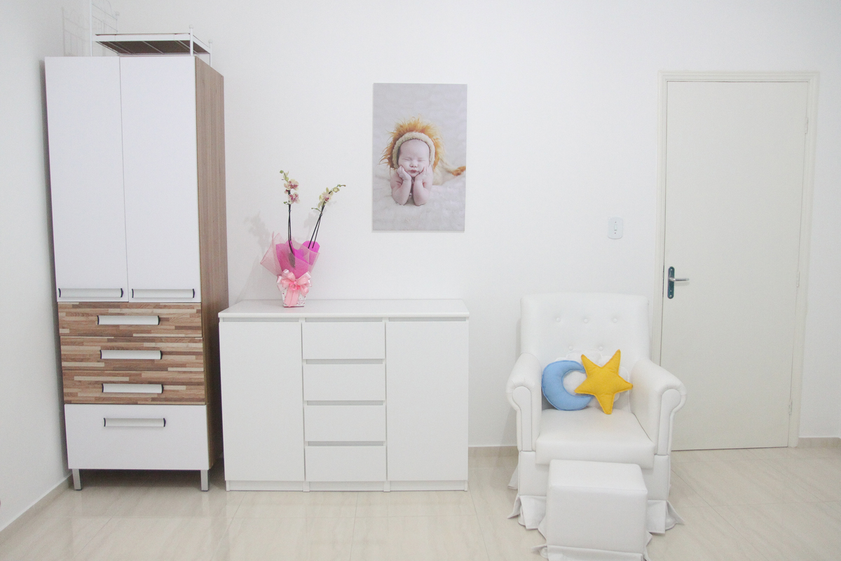 A mamãe tem um cantinho especial, com a cadeira de amamentação para que fique confortavelmente curtindo cada click realizado pela tia Dri! E quem pensa que esquecemos do papai se engana! Criamos um espaço funcional, em nossa sala de edição, onde ele pode se distrair com TV a Cabo, video game e wifi.